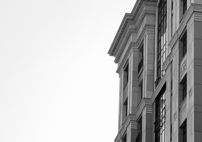 Первый этаж – гранит, потом идет раскреповка по фиброцементным панелям, дальше – многодельный декор нижних ярусов. Выше – более светлый фасад, который заканчивается совсем светлой частью с карнизом. На черно-белой фотографии хорошо видны членения верхнего карниза и панелей пилястр, как будто они сделаны из камня. На самом деле карнизная часть выполнена из стеклофибробетона. Не могу сказать, что пропорции получились совсем уж идеальными, но в целом выдержать дом на высоком уровне как при восприятии с дальних точек, так и при приближении, думаю, получилось.
