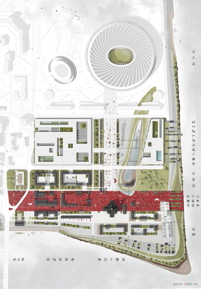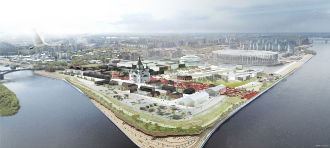 Концепция развития территории нижегородской Стрелки, разработанная архитектурным бюро «Архслон», получила золотую награду фестиваля за подход к организации планировочной структуры одной из самых значимых частей Нижнего Новгорода. За основу авторы предложили взять некогда существовавшую на Стрелке Макарьевскую ярмарку с квартальной застройкой и торговыми павильонами. Помимо воссоздания исторической сетки застройки авторы предложили организовать широкий бульвар, возродить озеро, благоустроить набережную и парк.
