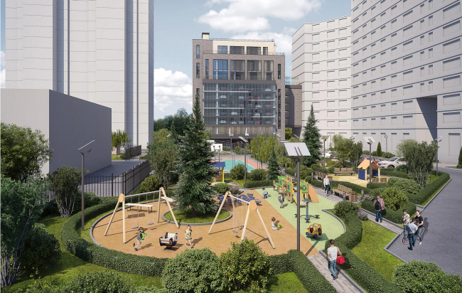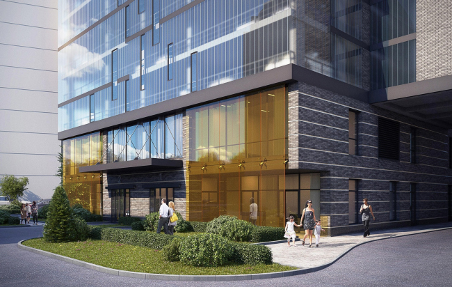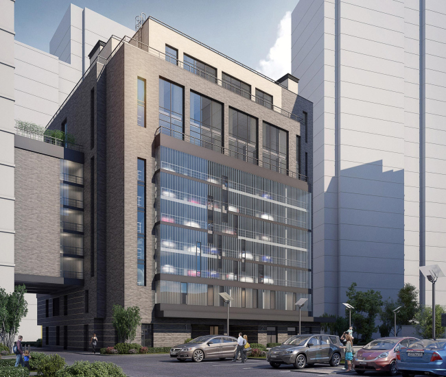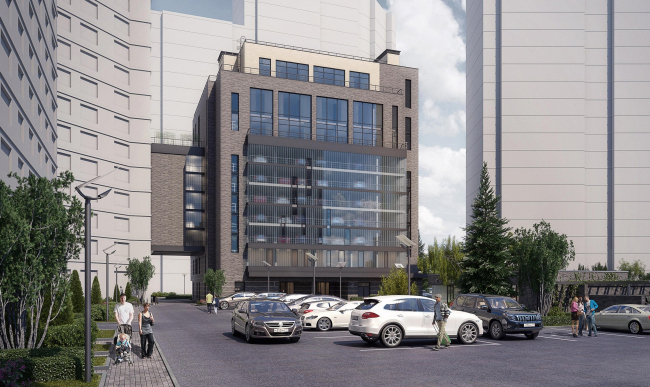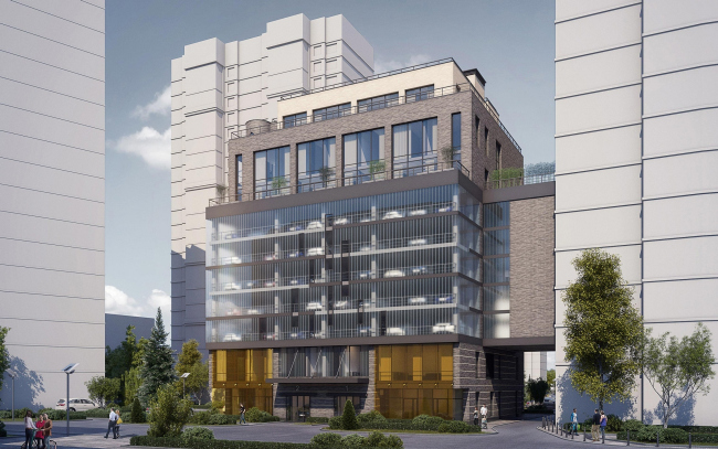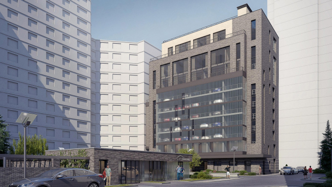 Впрочем архитекторы смотрят на свои десятиэтажные гаражи-офисы не только технически, но и эстетически, считая их главным акцентом двора. Части, отведенные надземной автоматизированной парковке, прикрыты полупрозрачным стеклопрофилитом; ночью они будут светиться, демонстрируя тени машин, передвигаемых автоматикой; «...калейдоскоп двигающихся автомашин вечером выглядит необычно, разрушая представление о парковке как об утилитарном техническом сооружении», – комментируют свое решение авторы. Эстетику поддерживает желтый экран перед первым этажом и стеклянные козырьки входных групп.