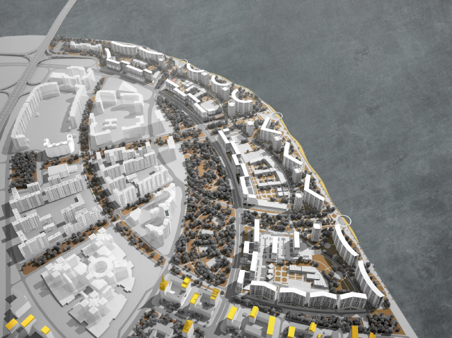 Весомое отличие от предыдущих проектов – общедоступный парк вместо идущей вдоль берега автомагистрали. Стоит отметить, что к такому решению студия пришла по инициативе заказчика. Идее домов, свободно стоящих в парке, и подчинена концепция застройки.