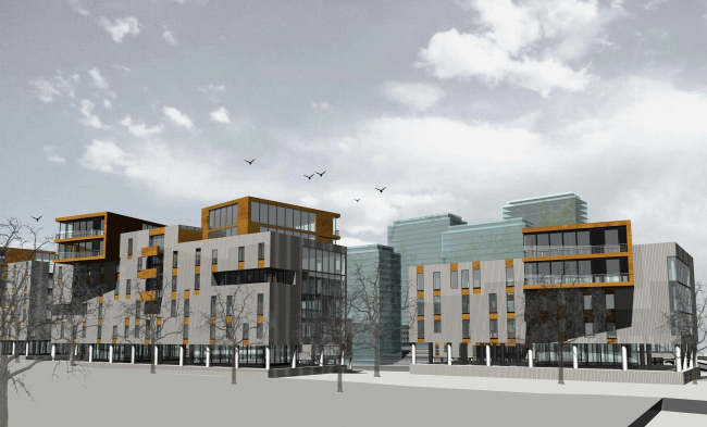 В дополнение к этим – весьма существенным – градостроительным коррективам архитекторы более детально разработали решение центральной части квартала. Здания выстраиваются в цепочки, одним концом «приросшие» к выходящим на бульвар магазинам, а другим – ниспадающие в сторону реки. Таким образом открывается максимум видов в сторону реки, а на торцевых стенах крайних домов устроены панорамные витражи.