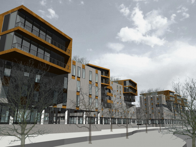 Террасность композиции, однако, не абсолютна – сбегающие к реке объемы то и дело пересекают поперечные вставки «пентхаусов» с большими панорамными окнами и длинными лоджиями. Фасады продольных объемов предполагалось отделать гофрированным алюминием (это давняя идея Павла Андреева – сделать фасад из такого, традиционно кровельного материала). Так что «основа» зданий серебристо-серая, а пентхаусы коричневато-оранжевые – цветовой контраст подчеркивает игру объемов.