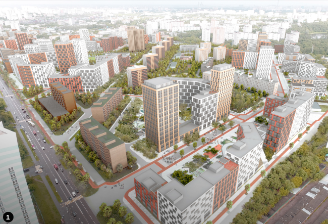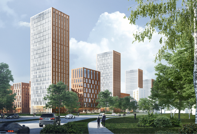 Проект, в создании которого участвовали Алексей Бавыкиин, Дмитрий Александров и Алексей Гинзбург, очень спокойной, сдержанной архитектурой и вниманием к памяти места: дома строятся на месте сносимых пятиэтажек, стремясь, насколько это возможно, сохранить существующую зелень. Базовая высотность – 7 этажей, высота башен – 14.