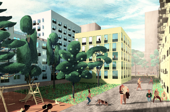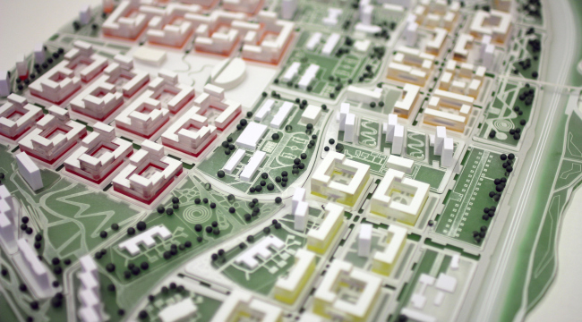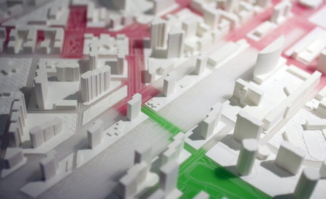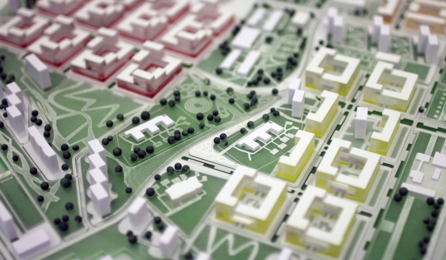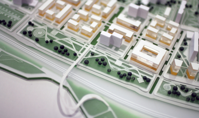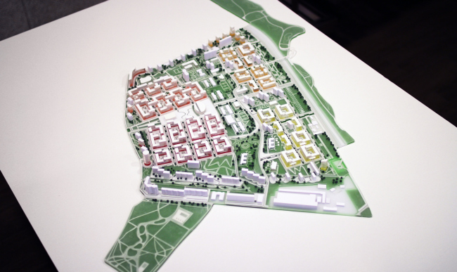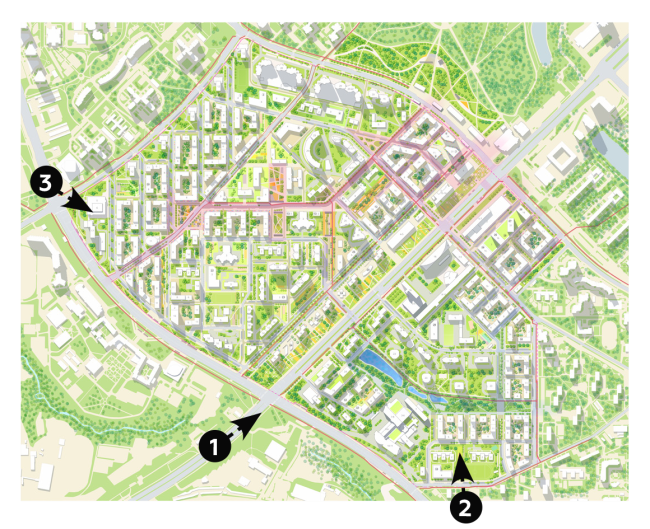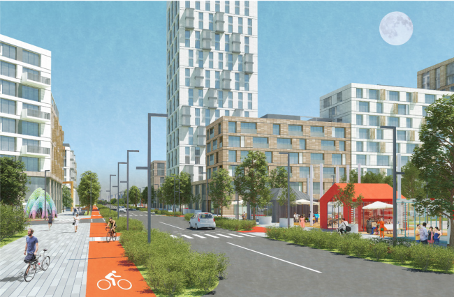 Всю застройку авторы проекта разделили на жилые дома для переселения, дома для продажи и инфраструктурные объекты – в частности, в центральной части территории запроектирован торгово-деловой парк. Увеличив плотность застройки, проектировщики попытались сохранить привычный масштаб зданий. Новая центральная ось – широкий зеленый проспект, соединяющий все части района. Вдоль него будут сформированы основные активности и зоны отдыха. В проекте продумана система разделения потоков пешеходов и велосипедистов. С автомагистралью проспект нигде не пересекается.