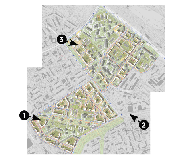 Северо-восточная часть территории, ближе к Моссельмашу, отдана башням, здесь приватные территории не внутри, а снаружи домов. Часть существующей застройки будет сохранена.