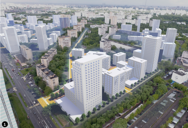 В проекте Никиты Явейна ось сохранена, и все новое строительство подчинено жесткой, если не сказать брутальной объемно-пространственной типологии: место пятиэтажек занимают крупные, плотно замкнутые, квадратные в плане кварталы 10-этажной высоты, причем верхние два-три из них трактованы как мансарды, их цвет отличается и они немного отступают вглубь. Вдоль берега пруда, наоборот, в шахматном порядке выстроились башни на пяти ярусах наземной парковки: их фасады превращены в крупные сменяющие друг друга паттерны, а на кровле в окружении высокой пилонады высажены деревья.