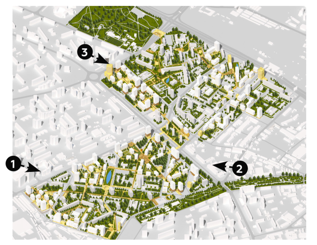 В качестве основного принципа реновации проектировщики выбрали принцип сохранения: новое строительство дополняет существующую застройку, в одном случае, формируя закрытый блок, в другом – ряд башен. Исследовав морфологию микрорайонов, проектировщики пришли к выводу, что формирование новых сквозных проездов здесь практически невозможно. Скелет района создаст ряд зеленых бульваров, соединяющих кварталы с набережной реки, расположенной в южной части. Вдоль бульваров будут сосредоточены главные архитектурные и высотные доминанты. Ближе к реке появятся 15-25-этажные жилые башни. В центре микрорайона, на территории городского парка расположатся школы и детские сады.