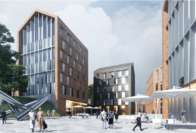 В основе проекта – формирование ясной структуры жилой застройки с разделением на общественные и приватные пространства. Все жилые здания, образующие кварталы с полузамкнутыми дворами, отличаются вариативностью фасадных решений. Центральный элемент района – большой общественно-деловой и культурно-образовательный центр, включающий транспортно-пересадочный узел, культурно-просветительский центр, студенческий кампус, предприятия торговли, сервиса, оздоровления и спорта. Еще одна точка активности – большая городская площадь-сквер.