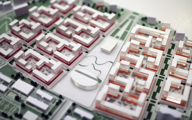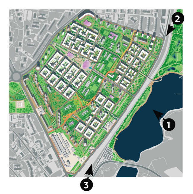 Здесь также сохраняются контуры трапециевидных кварталов – преимущественно вдоль улицы Лавочкина. Часть существующих отдельно стоящих кирпичных и панельных зданий также предлагается сохранить, замкнув их новыми жилыми домами разной этажности. Благодаря этому будут сформированы приватные дворовые пространства. Капиллярная система пешеходных бульваров и прогулочных аллей призвана сделать район проницаемым. Все первые этажи отданы общественным и коммерческим функциям. На каждой из «половинок» территории предусмотрен небольшой искусственный пруд миндалевидной формы.
