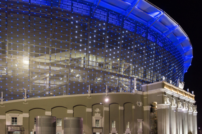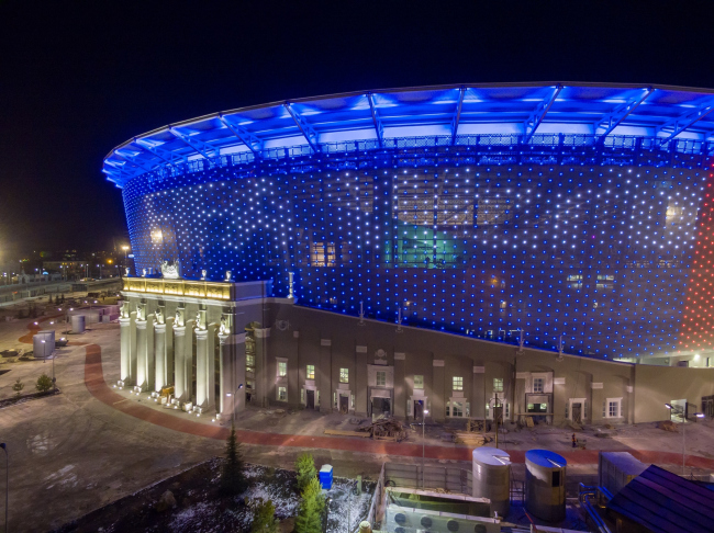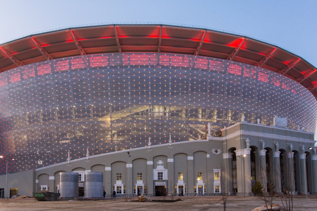 На фасаде смонтирована встроенная архитектурная подсветка. За перфорацией кассет спрятали более шести тысяч светодиодов, которые позволят воплотить любые световые сценарии, проецировать надписи и узоры, причем не только на стены, но и на крышу. Кровля стадиона опирается на восемь пилонов. Она не привычно плоская, а вогнутая, с верхним эластичным мембранным покрытием из полимерной ткани.