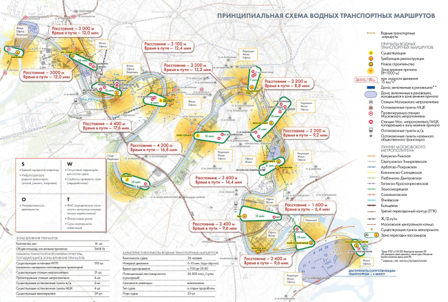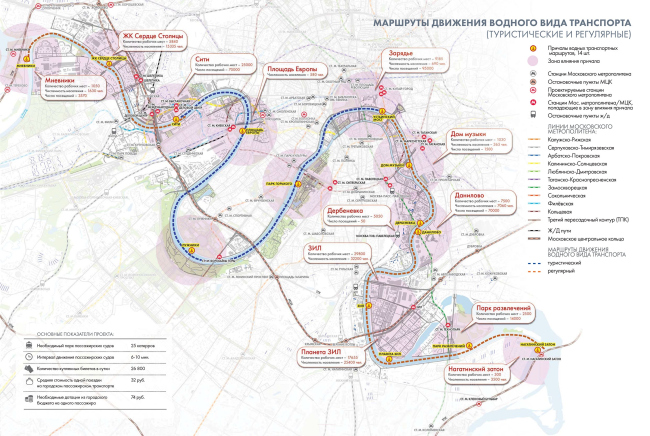 Расстояние между причалами, входящими в маршруты для транспорта общего пользования – 2-3 км, 3,5-4 км для экскурсионного маршрута. Расстояние между двумя остановками судно должено преодолевать в среднем за 10 минут (от 6 до 18). Городской наземный транспорт в целом движется примерно с той же скоростью, хотя остановок у него больше; метро, конечно, быстрее. Предполагаемый интервал движения «речного автобуса» – 10 минут. Расчеты показывают, что речной транспорт общего пользования сможет перевозить до 26 000 пассажиров в сутки. В сравнении с московским метро, которое в сутки больше 8 млн человек, это очень мало. Но больше, чем ничего – сейчас ведь речной транспорт отсутствует в принципе, а будучи создан, возьмет на себя часть транспортной нагрузки и, с другой стороны, сыграет некоторую роль в разнообразии выбора транспорта, что тоже важно. Речной транспорт – своего рода «вишенка на торте» сети транспорта общего пользования большого города: не так важен ее объем, сколько само присутствие, обогащающее впечатления от города.