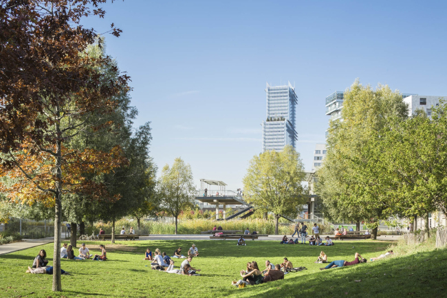 Среди «зеленых» компонентов проекта – двухслойный вентилируемый фасад повышенной эффективности, с вертикальными профилями и открывающимися в интерьер окнами (отражение света – 34%), тепловая инерция, 2000 м2 солнечных батарей на восточном фасаде (производительностью 175 МВт·ч/год), сбор дождевой воды. Потребление энергии составляет 75 кВт·ч/м2/год, и даже 50 кВт·ч/м2/год в высотной части.Парижский судФотография Sergio Grazia © RPBW
