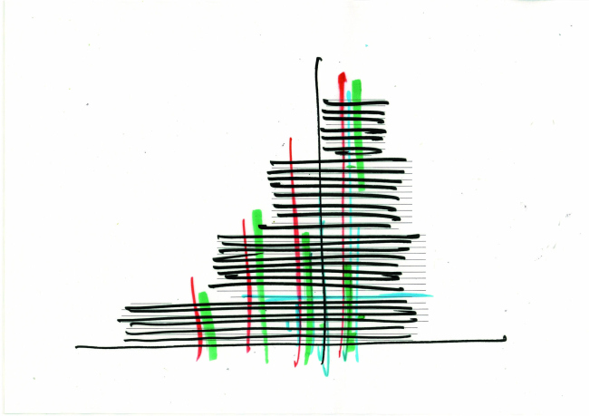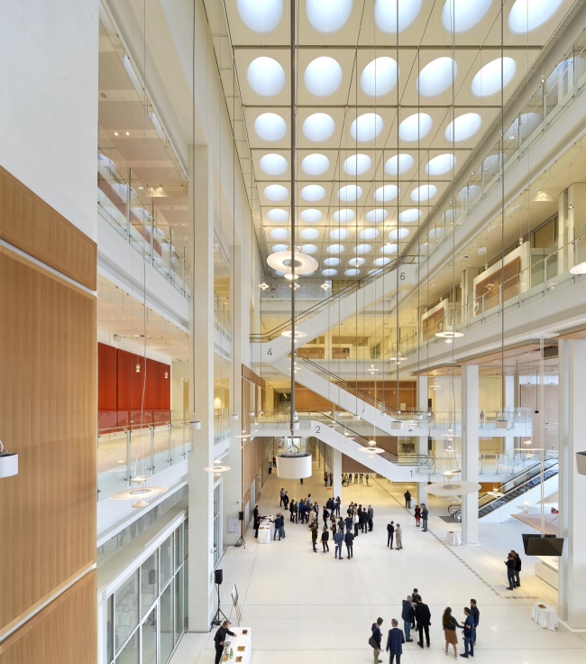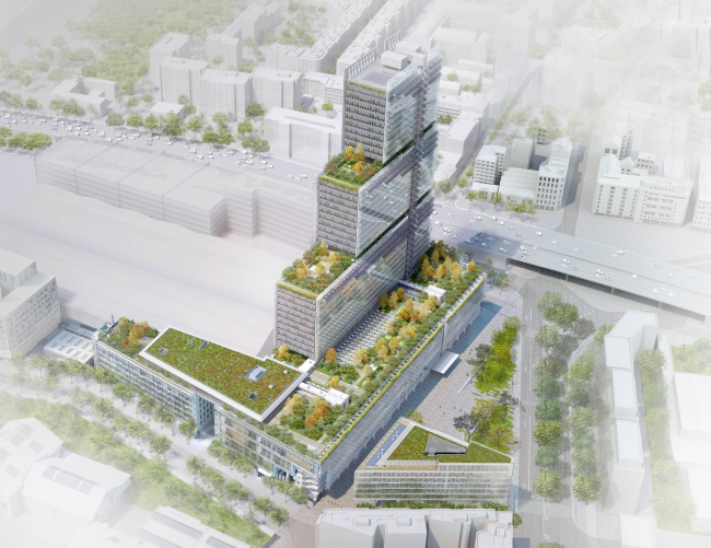 Заказчики, частно-государственное партнерство, хотели получить ансамбль из двух корпусов, с залами заседаний и с офисами, однако архитекторы RPBW предложили объединить все функции в постройке из L-образного «цоколя» и трехчастной башни на нем: на площади около 100 000 м2 каждый день, начиная с открытия в апреле 2018-го, будут находиться порядка 8800 человек.