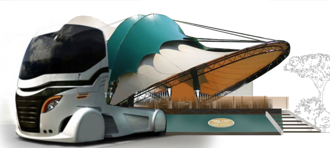 Первое место в номинации «Концепция ресторана street food» занял Никита Тимонин (Санкт-Петербург). Он предложил мобильную конструкцию, которая может менять форму в зависимости от необходимого функционала и погодных условий – «от бутона до распустившегося цветка». Концепция заведения – вегетарианское кафе – сочетается с общей идеей экологичности проекта.