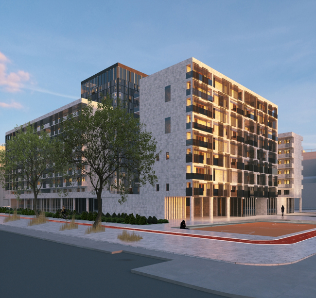 В отличие от голландцев, архитекторы из Македонии предпочли не описывать свой проект. Участок здесь не разделен на две-три соподчиненных площадки, а трактован как единое целое: 4 корпуса окружают двор, довольно сильно отступая от контура территории, засаженного строем деревьев и превращенного в бульвар. Здесь как-то все по-максимуму: в башне 18 этажей, в остальных домах по 9. Подковообразное подземное пространство обеспечивает парковку домам и супермаркету – да-да, здесь запланирован именно супермаркет, а не магазинчики в первых этажах. Все это удобно и практично, хотя не очень модно; кажется, что проект отличается от других большим реализмом, так что хочется заподозрить, что авторы вынесли на конкурс что-то из своих не пошедших в дело работ. Довольно неожиданно преобладание галерейных домов: их два из четырех, что придает предложению, также как и каменные фасады, «южный» привкус.