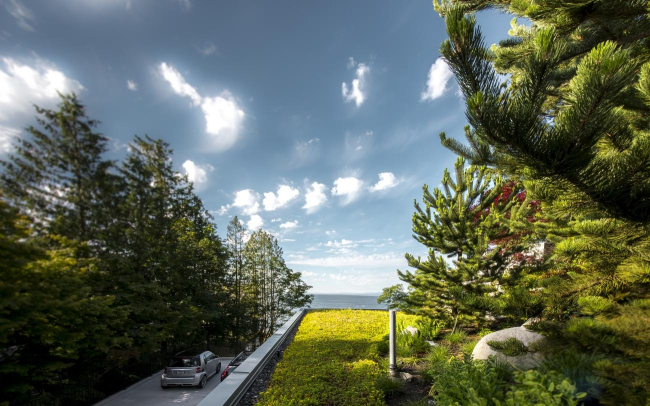 Несмотря на сложное географическое положение здания – береговой ландшафт со скалистым грунтом на крутом склоне, покрытом густым лесом, – владельцам Gleneagles Drive Residence и проектировщикам удалось создать симбиоз жилого и садово-паркового пространства, включающего зеленую крышу и стоянку.