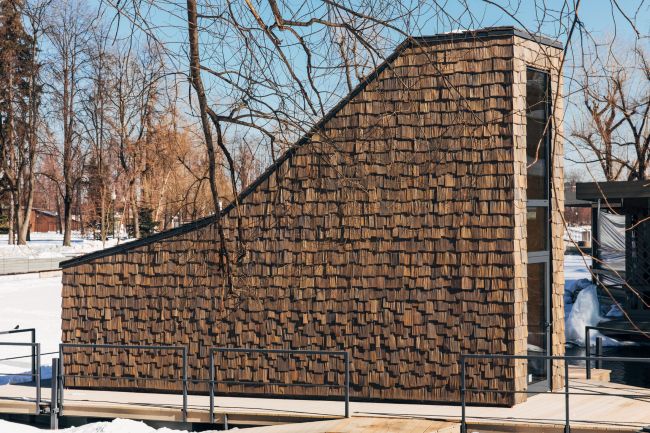 Доминантой пруда стал домик для лебедей. Он пришел на замену грубому свайному сараю 1960-х годов, который располагался примерно в том же месте – в углу со стороны Титовского проезда. Архитекторы решили, что домик прекрасно справится с ролью арт-объекта: он хорошо виден со всех сторон, но при этом с ним невозможно взаимодействовать, так как доступ есть только у персонала.