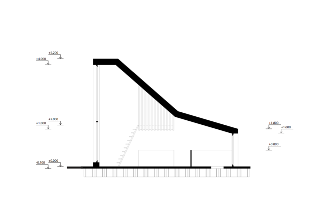 Домик построен на плавучем основании, без фундамента и свай, его можно передвигать. Он получил функционально оправданный и в тоже время необычный силуэт. Высокая часть предназначена для людей, ухаживающих за птицами, здесь же в антресолях хранится сено. В приземистой зоне хозяйничают только лебеди. Домик стоит на деревянной платформе, которая образует террасу с трапами по всему периметру, чтобы птицы могли свободно спускаться в воду и возвращаться. С берегом его соединяет небольшой мостик.