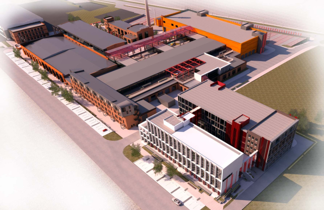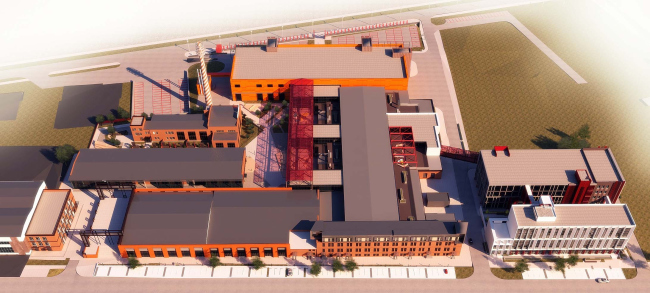 Проект реновации промзоны в Вологде, предложенный архитекторами АртСити, сохраняет конструктив и даже стены, но довольно радикально освежает внешность. Кроме того между корпусами должны появиться переходы и, конечно же, общественные пространства.