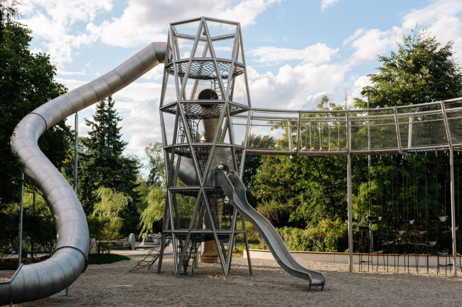 называется «Салют», расположена на месте бывшего временного павильона Cигеру Бана и построена музеем современного искусства «Гараж». Он занимает два гектара, на ней 29 качелей разных видов, причем часть из них доступна для детей в инвалидных колясках, и в общей сложности 9 тематических зон: для игр с песком, цветом, звуком, высотой и глубиной, а также для игр с водой – акваплощадка со 100 метрами каналов. Высота одной из игровых башен – 9 м, и с нее открывается вид на весь парк Горького. Название площадки восходит к имени детского сада, в 1930-е годы располагавшегося на ее месте.