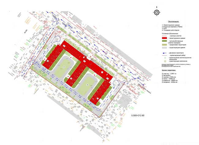 Рельеф участка опускается от улицы Саморы Машела в глубину квартала на 3,6 метра. Архитекторы воспользовались этой особенностью для организации дворов – в центре каждого появилась повышенная площадка, окруженная широкими пандусами пожарных проездов: ближе к улице она находится почти в том же уровне, что и выход из первого этажа, а у наружного контура приподнимается козырьком, образуя свободную от машин террасу с травой и детскими площадками. Под каждым козырьком помещается по 4 наземные парковки, что выглядит довольно любопытно и напоминает средиземноморские города; еще 58 мест распределено по периметру дома. Подземные парковки разместились в минус-первом этаже под жилыми корпусами.