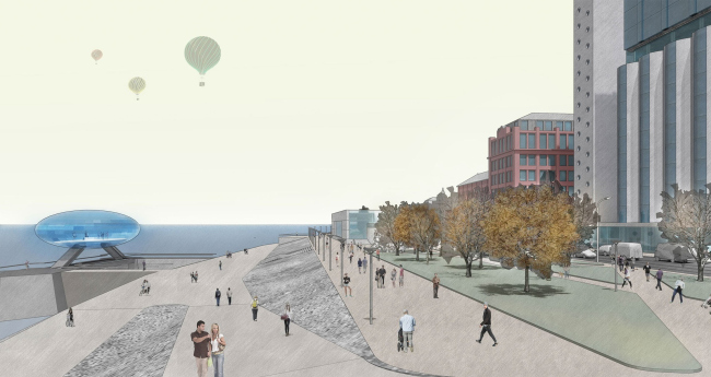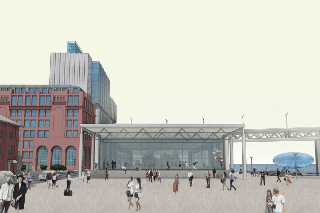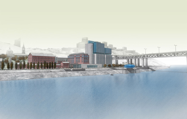 Берег Оки согласно проекту превращается в благоустроенную прогулочную набережную с двумя точками притяжения: бывшим складом, переоборудованным в универсальный зал площадью 1500 м2, и небольшим кафе в форме эллипсоида на причальных конструкциях.