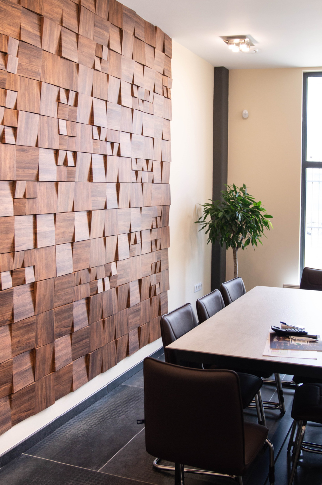 Открытое офисное пространство, место работы ипотечных консультантов и брокеров, обозначено наклонными опорами, облицованными HLP-панелями под дерево. Эти «деревья» продолжают заданную парковую тему, как если бы они проросли сквозь павильон. Экологической образности не чужда и переговорная с рельефной деревянной стеной.