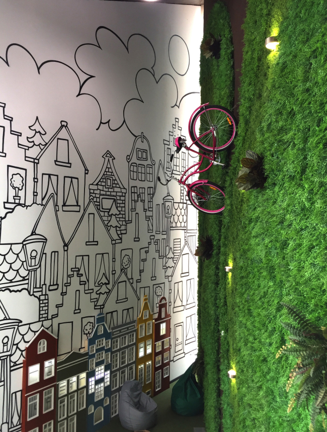 Основная изюминка проекта жилого комплекса – большой зеленый двор-парк с фонтанами. ЖК даже хотели поначалу назвать Селигер-Парк. Поэтому в интерьере появилась декоративная зеленая стена, обыгрывающая план парка, образно – вариант так называемого вертикального сада. В данном случае растения искусственные, и все же подобные детали действуют на посетителя умиротворяюще, ведь человек – существо семиотическое.