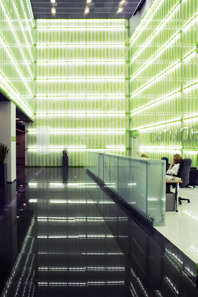 Полосатость и отражения свойственны не только внешности этого здания, но и его интерьерам, в частности, холлам главной компании-арендатора «Ситидел». Здесь полосы мягче, потому что цветные и светятся, но их ритм – тот же, и он так же повторяется в блестящей плоскости полированного пола, создавая под ногами намек на «антимир» – впрочем, ненавязчивый. Фотография Алексея Народицкого