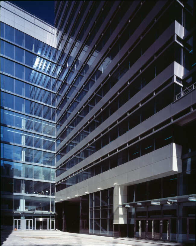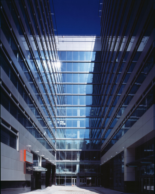 Особенно отчетливо этот прием заметен во внутренней «улице» между двумя корпусами – ее тупиковый торец стеклянно-зеркален, полосы отражаются в нем и улица кажется длиннее. Таким образом здание отражает не только небо (к чему все привыкли) и даже не окружающие постройки (к этому тоже привыкли), оно отражает само себя, завязывая внутри себя некоторую интригу, дополняющую асимметричную игру прямоугольников, впадин и выступов.
