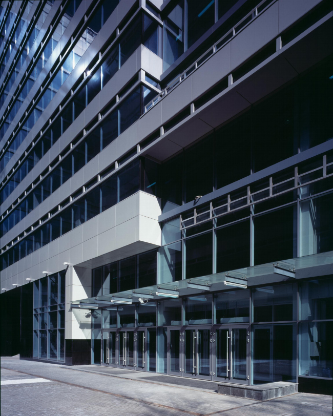 Здание имеет два вида фасадных плоскостей. Одни покрыты широкими бело-стеклянными полосами, соединенными строчками горизонтальных окошек. Несмотря на стерильность «бумажного» белого цвета эти плоскости более материальны и выступают там, где нужен относительно непроницаемый «серьезный» фасад: на Садовом кольце, где из них складывается «парадный» фронтальный объем, по сторонам упомянутой внутренней улицы и на тыльной стороне, обращенной к железной дороге.