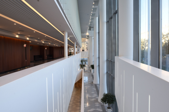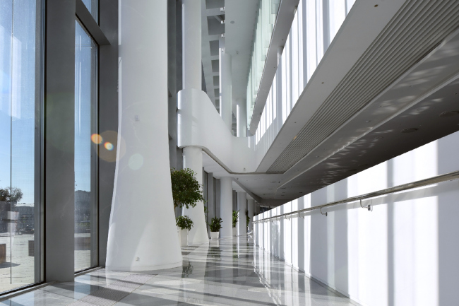 Здание, как и любая современная общественная постройка такого масштаба и задач, рассчитано на эмоциональную реакцию и вызывает ее – это определенно архитектура wow-эффекта. Пространство фойе, белое, высокое, цельное, кажется линзой, аккумулирующей неброский с наших широтах свет, днем впитывает и усиливает лучи, ночью «отдает» – светится целиком, преломляясь полосками стеклянных ламелей.