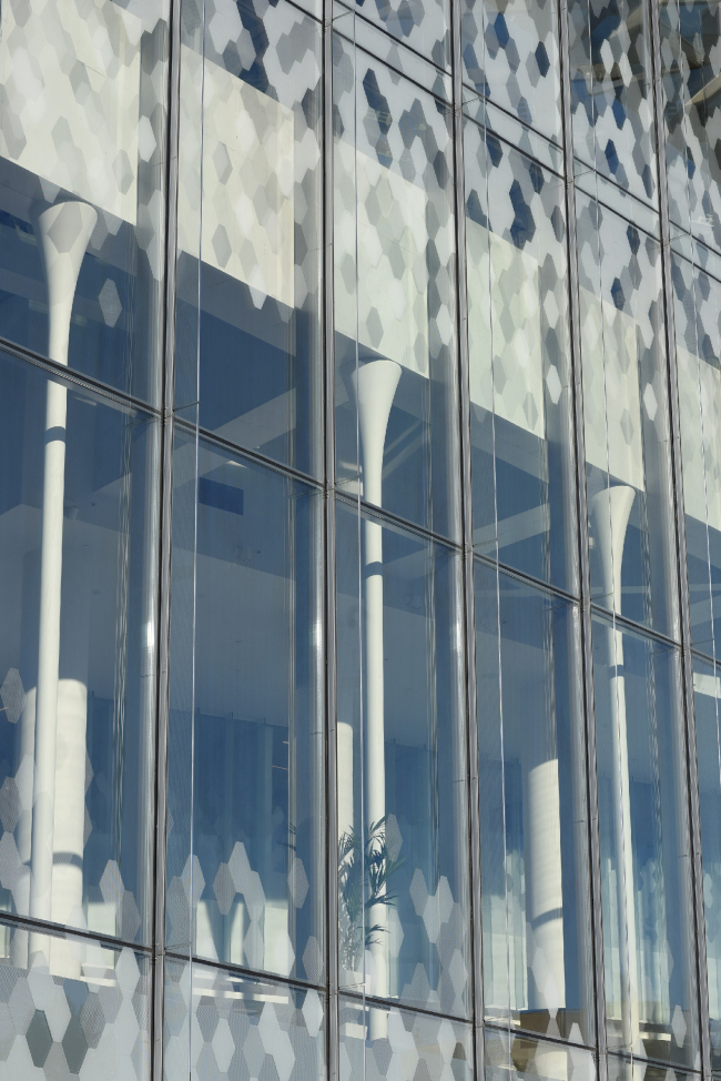 Промежуточность пространства фойе, его одновременная принадлежность улице и зданию, подчеркнута еще и тем, что стены офисов администрации, расположенные в третьем ярусе, решены так же, как и внешние стены – из стекла с ламелями и шелкографией; как будто часть внешней стены отступила внутрь. Или как будто находясь в фойе мы находимся отчасти внутри, но отчасти все же и снаружи. Прием удобен и для сотрудников, они получают дневной свет из фойе как из атриума.