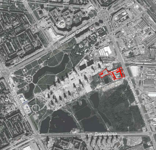 Участок расположен во Фрунзенском районе Петербурга, недалеко от пересечения крупных магистралей – проспекта Славы и Софийской улицы. Эта часть города сейчас выглядит довольно уныло: шестиполосные дороги, склады и промзона на сотни метров, парочка кладбищ и сталагмиты многоэтажек, вырастающих из пустырей.