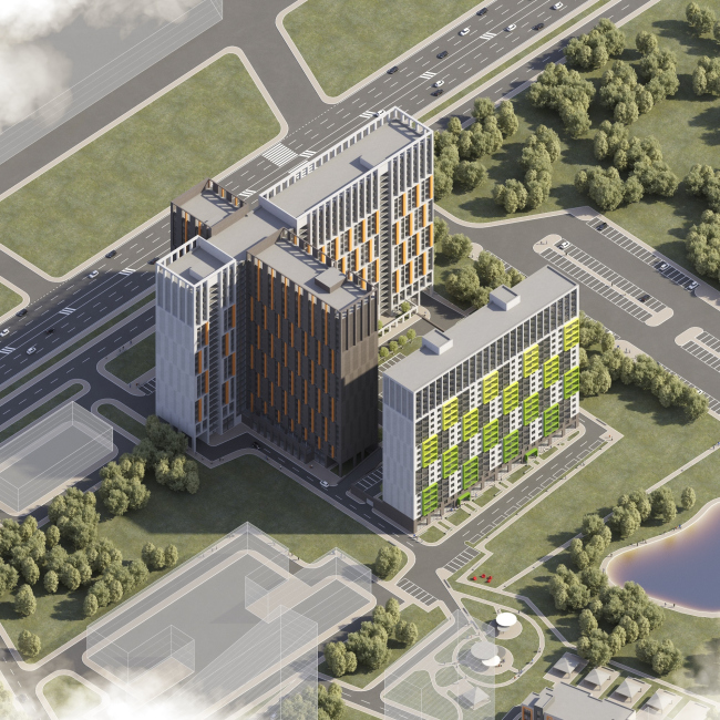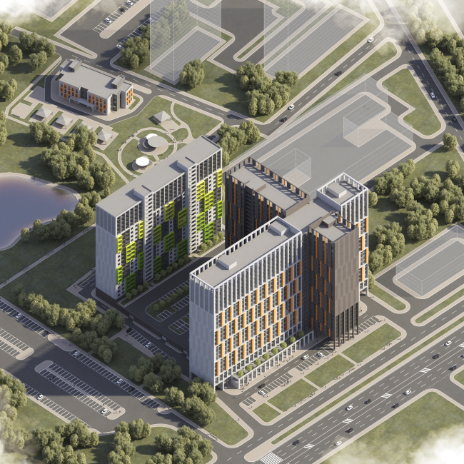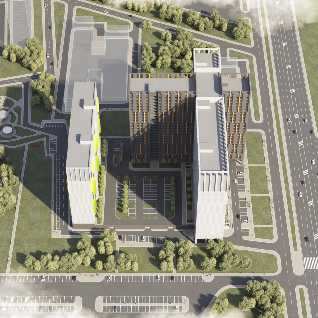 На самом деле территория, отведенная для реализации проекта, состоит из двух смежных участков: на первом, площадью 20 950 м2, должны разместиться жилой дом, гостиница и паркинг, а на втором, в пять раз меньшем – 4 050 м2, детский сад на 90 мест. Первый участок сложной формы – два условных разновеликих прямоугольника, связанных ломаным «перешейком». По рекомендации главного архитектора города Владимира Григорьева малый прямоугольник полностью отдали озеленению и благоустройству, что позволило добиться проницаемости и связи между двумя большими парками. В оставшемся пространстве пришлось укомплектовать все остальное. Анатолий Столярчук признается, что конфигурация участка, инсоляционные ограничения и пожелания заказчика, который, в частности, категорически отказался от подземных паркингов, сделали рамки проектирования очень тесными, что, впрочем, в то же время способствовало появлению эффективного и нестандартного решения.