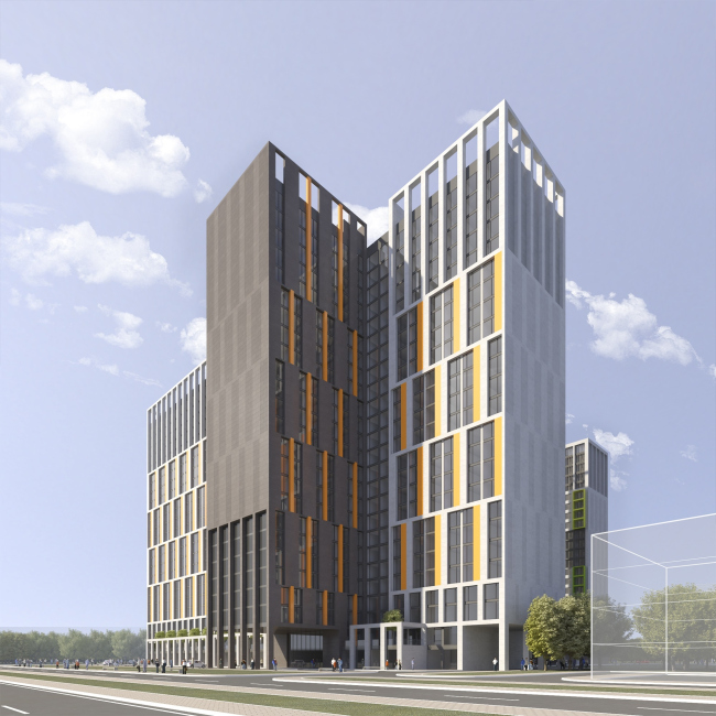 Обширные плоскости главного фасада разделены на крупные четырехэтажные блоки из сдвоенных окон, чередующихся с полосками белого и оранжевого цветов, которые отвечают на колористику «Софии». Последние пять этажей накрывает белая «решетка» простенков, продолженных до небольшого парапета крыши. Такие крупные объемы сделаны с оглядкой на то, что большинство зрителей будет воспринимать архитектуру комплекса на скорости – из окон автомобилей, проносящихся по Софийской улице.