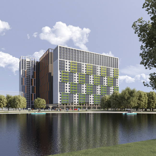 Жилой дом до некоторой степени «отзеркаливает» гостиницу: первые этажи также заняты магазинами, фасад разделен на крупные четырехэтажные блоки, такая же «решетка» надета поверх последних пяти этажей, в том числе со стороны глухих торцов. Но здесь появляется больше горизонтальных членений, а также выступающие объемы балконов цвета сочной весенней зелени, которые чередуются с плоскостями застекленных лоджий и обычными окнами на фоне белой «подложки».