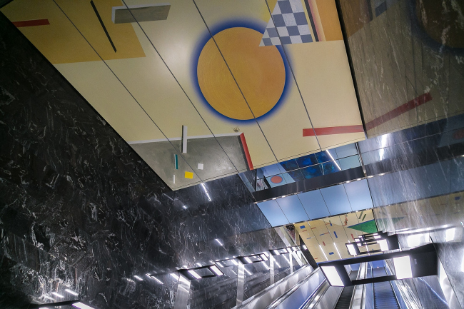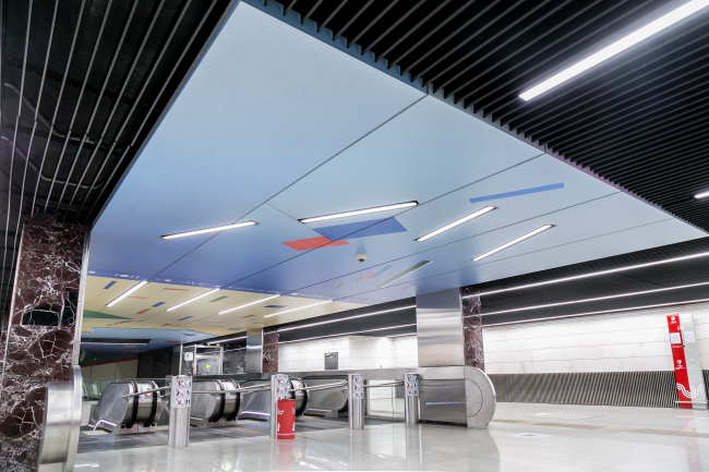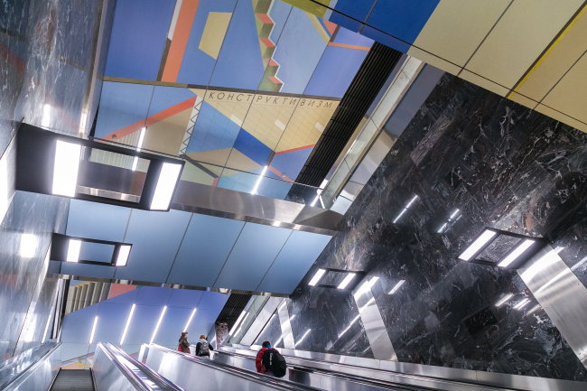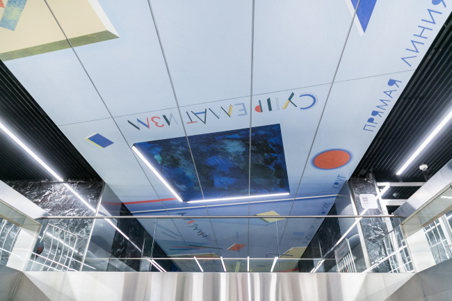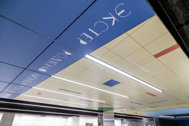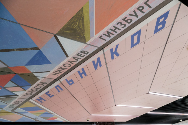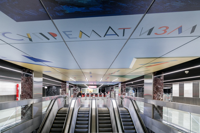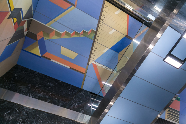 Восточный вестибюль посвящен супрематизму, а западный – конструктивизму. Потолки кассовых залов и спусков над эскалаторами покрыты монументальными росписями, более строгими, ортогональными там, где речь об архитекторах, более динамичными в случае с художниками. Мы видим на потолке знакомые мотивы, в том числе увеличенный во много раз черный квадрат Малевича и надписи «Супрематизм», «Экстер», «Родченко». Надписи выполнены аутентичными шрифтами, супрематическими или конструктивистскими, в западном, архитектурном, вестибюле – как будто взятыми из журнала СА. Расчет, в частности, был на то, что люди заинтересуются, посмотрят в интернете.