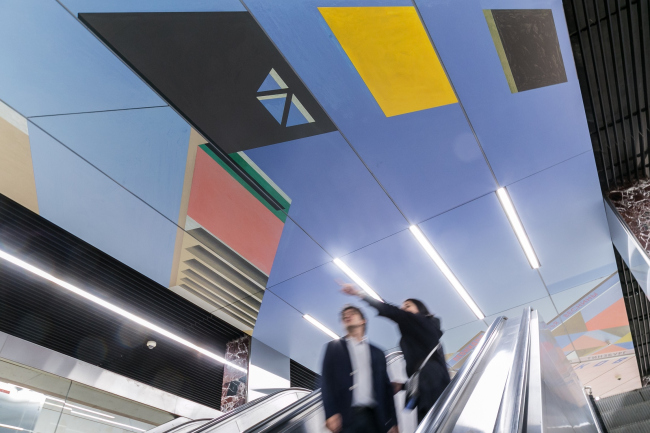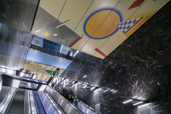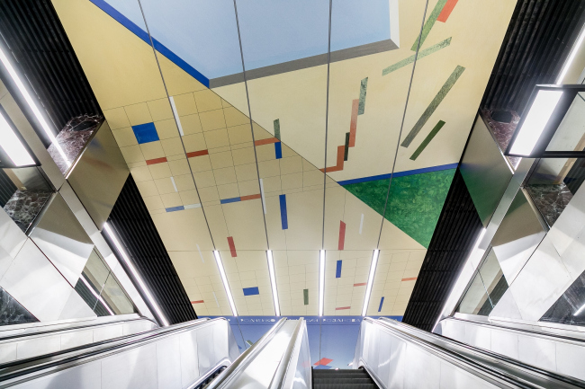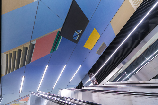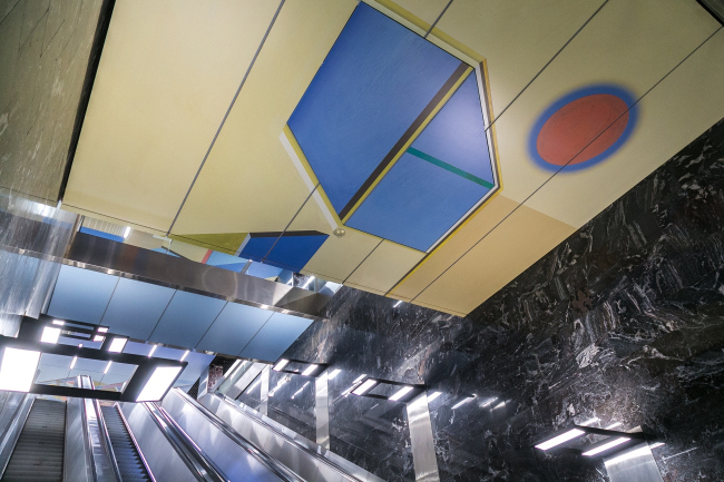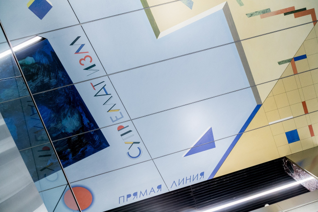 Основная задача состояла в том, чтобы композиционно совместить живописные мотивы авангарда и лаконичное, строгое пространство станции. То, что все это размещено над эскалатором, на изломе плоскостей и воспринимается в движении, добавляет и без того энергичным композициям дополнительную динамику.