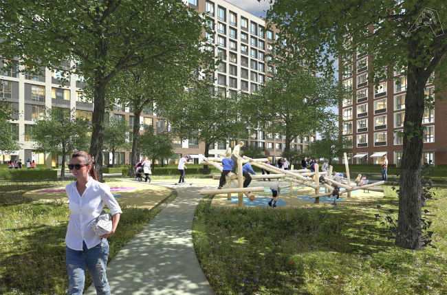 Семь площадок – семь решений, где внимание уделено как малым архитектурным формам – лавкам, беседкам, так и озеленению. Игровые детские площадки, напоминающие скульптуру из дерева, оформленные арками променады, площадки для созерцательного отдыха в окружении кустарников и деревьев, подобранных так, чтобы выглядеть привлекательно и в зимний период – все должно способствовать психологическому комфорту будущих жильцов.