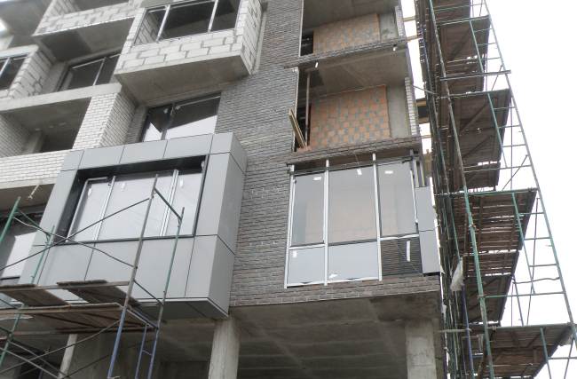 Но использовать клинкер на всех фасадах не позволял бюджет, и авторы предложили комплексное решение: не отказываясь от кирпича, комбинировать его с металлическими кассетами. Нашли отечественного производителя, предложили собственные решения кассет – в итоге по расчетам цена одного квадратного метра такого фасада составляет всего 9 000 рублей, что достаточно дешево. Различные сочетания нейтральных оттенков серого, бурого и коричневого клинкера и гладких поверхностей цветных кассет, выносы эркеров оживляют фасады.