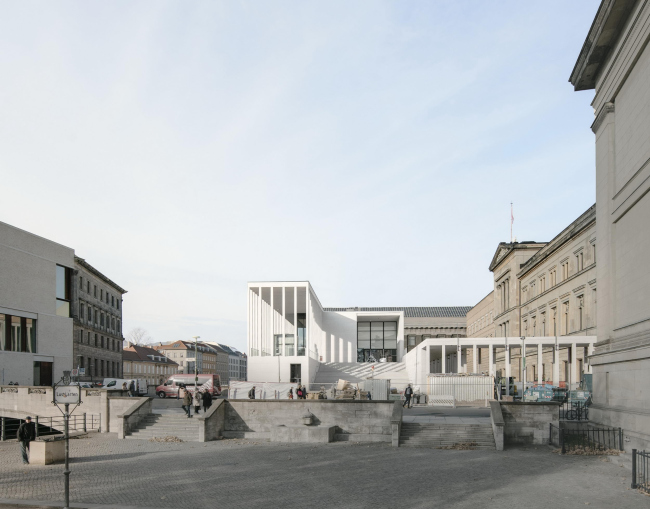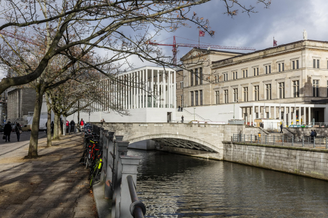 Все это рассчитано на большой поток посетителей, однако не менее важна и иная функция постройки, которую Чипперфильд назвал «ответственностью общественного здания в сердце большого города». Галерея обращена к каналу Купферграбен, парку Лустгартен и Дворцовому мосту высоким цоколем и колоннадой над ним. Искусственный и натуральный камень облицовки отсылает к историческим постройкам центра Берлина, а язык архитектуры – к окружающим ее сооружениям Шинкеля и Штюлера. Она физически продолжает колоннаду Штюлера, которую тот довел до Нового музея, а по смыслу – развивает заложенную тогда, в XIX веке, тему классического общественного пространства, открытого для граждан прусского Акрополя. Основной уровень галереи будет доступен всем в любое время суток, что подчеркивает роль Музейного острова не как туристического аттракциона со статусом объекта ЮНЕСКО, а как полноценной части одной из самых живых столиц Европы.