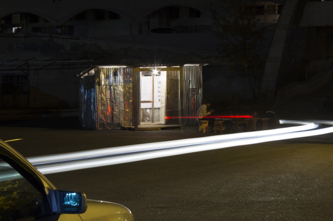 Авторы намеренно самоустранились, не делали чертежей, материал собрали где смогли, а строителям дали только устные рекомендации и полную свободу, лишь наблюдая за процессом. Между тем хухула получилась – не просто выгородка из разряда придорожных, а целый домик с крыльцом и хорошими, покрытыми слегка облупившейся белой краской, дверьми. Внутри опоры, стол, планшеты с проектом – довольно типичный выставочный стенд. Снаружи блестит измятый профнастил, гармонирующий с брутально-неряшливым постсоветским и позднесоветским окружением – ночью подсвеченный металл светился как лампа, и совершенно очевидно, что несмотря на отсутствие чертежей авторы любуются своим произведением: и сиянием с свете фар ночью, и солнечными бликами, проникающими сквозь щели днем. Эстетических качеств оно отнюдь не лишено, напротив, красиво – нас, в сущности, знакомят с эстетикой самостроя, который в широких кругах принято презирать и «очищать» от него город.