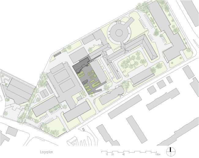 Мастерская архитектора Михаэля Валльраффа десять лет назад выиграла конкурс на проект реконструкции и уплотнения кампуса Центра ПТУ в районе Санкт-Петер: это комплекс из нескольких профессиональных училищ, где готовят строителей разных специальностей, автомехаников, парикмахеров, фармацевтов и т.д. Валльрафф и его коллеги предложили разместить плоские корпуса-пластины по периметру участка, а его центр занять невысоким «цехом» с эксплуатируемой кровлей. В результате, наряду с необходимым уплотнением, создается новое общественное пространство.