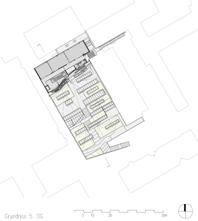 Расположение мастерских в двухэтажной части обусловлено нуждами освещения: они снабжаются солнечным светом через проемы в перекрытиях и световые колодцы. Многоярусная структура части лабораторий облегчает их техническое и экономическое снабжение и создает ясную планировку. Естественное освещение обеспечивает остекленный северный фасад. Два лестничных и рекреационных зала создают пространство для неформальных встреч и общения учащихся. С западной стороны новое здание в любой момент может быть расширено.