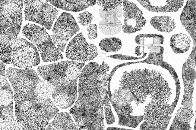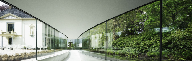В исторической части потребовалось построить павильон для лекций и выставок, однако архитекторы не должны были нарушать сложившийся ландшафт и сеть дорожек. Определяющими для плана здания стали три линии: берег пруда, край партера перед виллой и опушка, проходившая здесь еще в XVII веке; в итоге получилась фигура, напоминающая треугольник в геометрии Лобачевского.