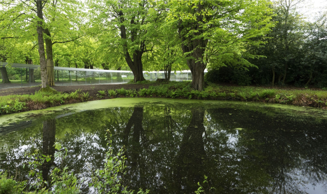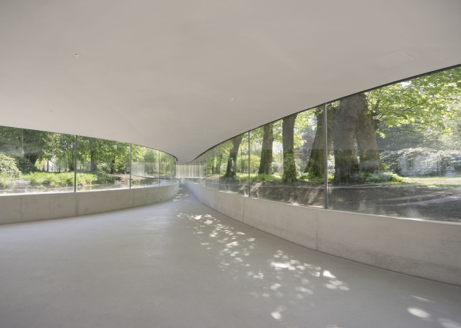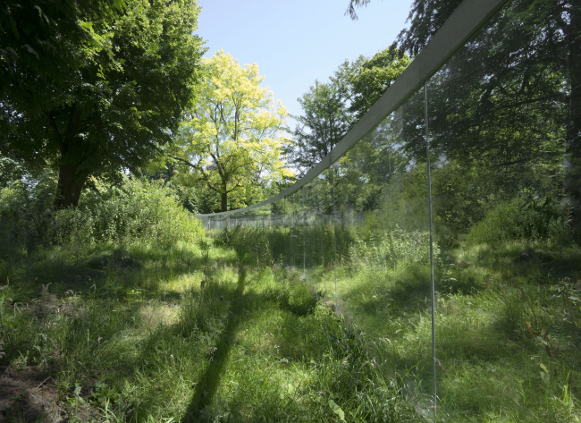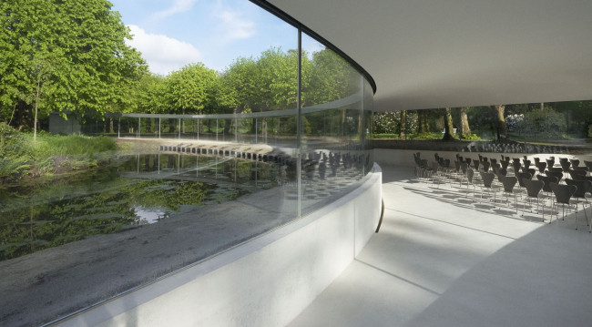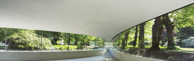 Павильон с несущими фасадами из ламинированного стекла растворяется в окружении, поэтому посетители вполне могут заметить его, лишь оказавшись совсем рядом. То же самое касается и интерьеров: даже лекционная зона с пониженным на метр уровнем пола визуально связана с окружением, в остальных частях граница между средой и внутренним пространством почти незаметна (нет дополнительных опор и использовано стекло повышенной прозрачности).