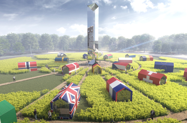 В дополнении к самой концепции, команда Асадова вместе с застройщиком представила математическое доказательство того, что территория нового района совпадает с географическим центром Европы. Вычислив середину между крайними точками Европейского континента они пришли к выводу, что центром европейской Ойкумены оказался круговой перекресток на Восточной эстакаде. Для него АБ ASADOV предложили инсталляцию: выкошенные контуры карты Европы с миниатюрными домиками, обозначающими столицы стран. В центре мини-Европы, авторы предложили установить вертикальную стелу-перископ, позволяющую наблюдать соседнюю строительную площадку с высоты птичьего полета.