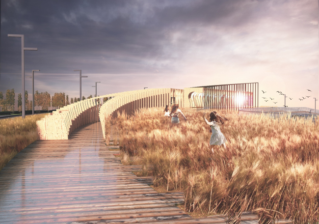 В центральной же части главного пруда авторы предложили смотровую площадку-обманку: бетонный желоб, пешеходный путь в котором расположен ниже уровня воды – своего рода мост, углубленный в воду, но сухой. Идешь по такому желобу, вода чуть ниже плеч, с одной стороны, можно вволю поплескаться и обнаружить себя вблизи водной глади, как будто купаешься или хотя сидишь на мостках, болтая в воде ногами, – ближе, чем обычно в городе. С другой стороны, если посмотреть со стороны, покажется, что человек идет по грудь в воде – тоже своего рода аттракцион для прохожих или, говоря точнее, смена точки зрения с банальной на необычную, остраняющую, как говорил Виктор Шкловский. Пожалуй, это одна из самых интересных «фишек» парка: сейчас важно предложить что-то не вполне ординарное, особенно активно в этом амплуа выступают мосты, начиная с полумоста в Зарядье. Но углубленный мост в пруду для России, вроде бы, – новшество.