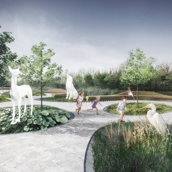 Появление в программе сафари-парка, также как и связанной с ним зоны «штрих-код и летний фестиваль», стало мерой отчасти вынужденной. В процессе работы выяснилось, что вдоль территории парка проложены три подземные трубы диаметром 160 см, снабжающие весь Воронеж питьевой водой. Их охранная зона должна быть постоянно доступна для аварийных служб – цветы посадить можно, но нельзя строить ничего капитального. Поэтому под штриховкой – трубы, по соседству территория фестиваля цветов. Растения временные, неприхотливые, а название «Лунный сад» происходит от основных цветов – белого и зеленого. Но цветы можно будет постоянно менять, так что эта зона станет самой непредсказуемой в парке. Сафари-парк – это скульптуры животных; их тоже планируется менять время от времени. Зону набережной от сафари-парка отделяет высокая трава, в ней также спрятаны площадки со скульптурами – это один из способов насыщения парка событиями: гуляя, открываешь все новые композиции.